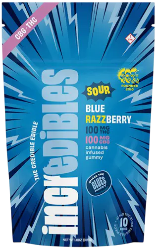 Incredibles’ Blue Raspberry (Sour Blue Razzberry) Gummies are tangy, fruit-forward edibles infused with THC and CBG for a balanced, mood-lifting experience. These gummies are part of Incredibles’ “credible edible” lineup, crafted with 100% pure cannabis oil blended into a homogeneous mixture to ensure accurate dosing and consistency. Each gummy typically contains 10 mg of THC and 10 mg of CBG, creating a 1:1 ratio that enhances both the psychoactive and therapeutic effects. The flavor profile is bold and refreshing, delivering the zingy sweetness of blue raspberry with a sour twist, designed to “chase the blues away” and spark a celebratory vibe.