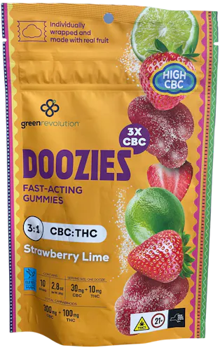 The 3:1 Strawberry Lime Doozies are crafted as an uplifting, fast-acting edible that blends bright fruit flavor with a cannabinoid profile designed to elevate your mood. Each gummy contains 30?mg of CBC and 10?mg of THC, giving the pack a total of 300?mg CBC and 100?mg THC. They’re made with vegan, kosher, natural, and gluten-free ingredients, and use Green Revolution’s UNET nano-emulsified full-spectrum oil, which breaks the cannabinoids into water-soluble molecules for quicker, more consistent absorption. Strawberry Lime flavor leans sweet and citrusy, and the “Elevate” formulation is positioned as a sativa-leaning experience meant to support energy, focus, and an upbeat, clear-headed lift.