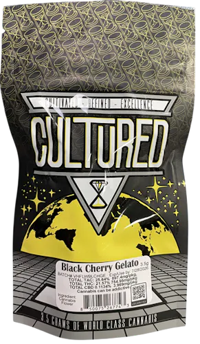 Black Cherry Gelato from Cultured is a rich, dessert-leaning hybrid that blends deep fruit sweetness with a smooth, relaxing high. This cultivar typically showcases dense, resin-coated buds with dark purple hues and bright orange pistils, giving it the kind of visual appeal that stands out immediately. Its aroma leans heavily into ripe black cherry, creamy vanilla, and subtle earthy gelato notes, with a faint hint of gas underneath that adds depth. On the palate, those flavors become even more pronounced—sweet berry, creamy dessert, and a soft herbal finish—making it a flavorful strain for people who enjoy fruit-forward profiles. The effects tend to start with a warm, euphoric lift that softens stress and brightens mood, followed by a smooth, body-relaxing calm that never feels overly heavy.