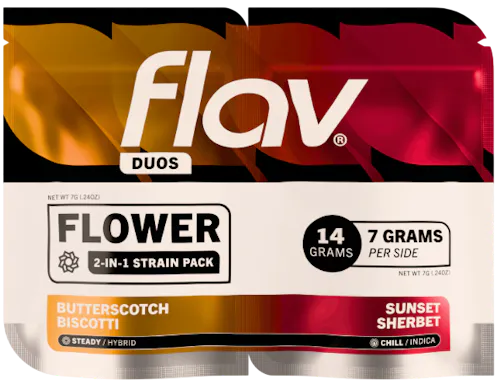 The Flav Duos Flower Butterscotch Biscotti / Sunset Sherbet 14g is a premium cannabis offering that combines two flavorful strains in one package, giving consumers variety and balance. Each jar contains 14 grams of hand-selected flower, split between the Butterscotch Biscotti and Sunset Sherbet cultivars. Butterscotch Biscotti is an indica-leaning strain known for its sweet, dessert-like flavor profile with notes of caramel, vanilla, and nutty earthiness, delivering a relaxing, body-heavy high perfect for unwinding. In contrast, Sunset Sherbet is a hybrid with fruity, berry, and citrus flavors layered over a creamy undertone, offering a more uplifting and creative effect while still maintaining a smooth, calming finish. Together, the duo provides a versatile experience: one strain geared toward deep relaxation and stress relief, and the other toward social, euphoric, and mood-enhancing effects. Packaged with Flav’s emphasis on quality, freshness, and terpene preservation, this 14g duo is ideal for cannabis enthusiasts who enjoy switching between flavors and effects depending on the occasion.