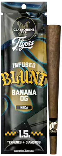 Meet the 'Loudest on the Block': Flyers 1.5g Infused Blunt. Crafted from premium indoor, full nug flower infused with THCa & liquid diamonds, natural terpenes and wrapped in an herbal blend cone made of chamomile, cacao, & yerba maté. A badass blunt built better. Let your body peel out with Banana OG. This strain will drive you absolutely bananas with its sweet flavor; and like a banana in the tailpipe, this heavy indica with shut you down. An ideal night strain, Banana OG will get you slipping into a barrel of comfort. Get lit or go split.