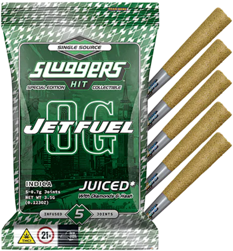 The Jet Fuel OG Pre‑Roll 5 Pack from Sluggers is built for smokers who want a loud, gassy, hard‑hitting experience wrapped in a clean, convenient format. Each pack contains five 0.7‑gram infused pre‑rolls (3.5g total) made from premium whole flower—not shake or trim. Sluggers layers the potency with a triple‑infusion blend of liquid diamonds, solventless hash, and high‑terpene extract, then finishes each joint rolled in kief for an extra‑dense burn and fast‑acting effects.