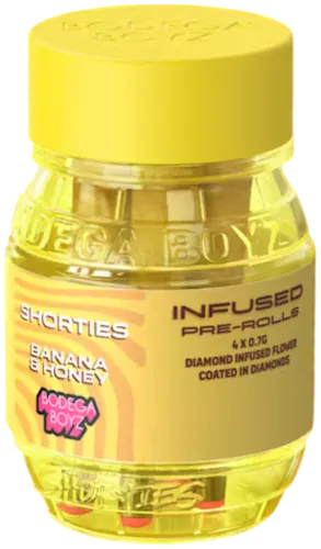 Satisfy your cravings with Bananas & Honey Shorties - a delectable fusion of sweetness and richness, neatly packaged in a convenient barrel stash jar. Each joint is meticulously crafted with .7 grams of premium flower, infused with diamonds, and coated with premium Bodega Boyz thca diamonds, housed in a stylish barrel stash jar.. Immerse yourself in the creamy sweetness of ripe bananas, complemented by the golden richness of honey for a flavor profile that's both comforting and delicious. Whether you're seeking a moment of relaxation or a burst of flavor to brighten your day, Bananas & Honey Shorties offer a delightful escape to a world of sweetness. It's time to treat yourself to this irresistible blend and indulge in the pure pleasure of bananas and honey. Reusable ceramic tips make this experience hit different.