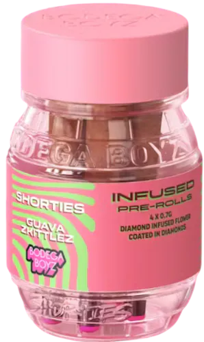 The Bodega Boyz Diamond Infused Guava Zkittlez is a standout product in their “Shorties” line, designed to deliver both flavor and strength in a compact format. Each pre-roll contains about 0.7 grams of high-quality hybrid flower, carefully infused with THCA diamonds and then coated with an additional layer of diamonds. The strain itself is a cross of Guava × Zkittlez, producing a juicy tropical essence of ripe guava that blends seamlessly with the playful, candy-like medley of Zkittlez flavors. The effects are typically described as calm, happy, relaxed, creative, and uplifting, making it versatile for unwinding after a long day or sparking inspiration in social or artistic settings.