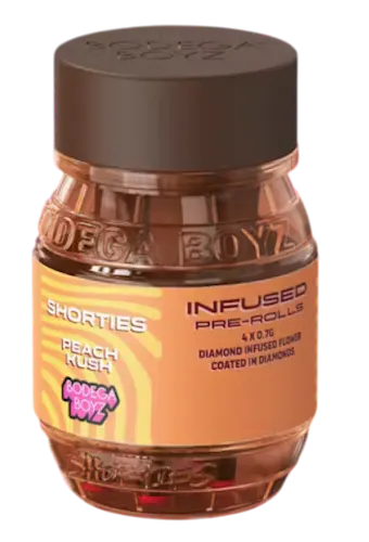 Peach Kush Shorties from Bodega Boyz are diamond-infused pre-rolls that blend luscious peach flavor with the calming depth of Kush, offering a potent and indulgent smoking experience. Each Shortie is meticulously crafted with about 0.7 grams of premium flower, infused and coated with THCA diamonds to amplify both flavor and potency. The strain is indica-dominant, delivering a smooth, fruity sweetness reminiscent of ripe summer peaches, balanced by earthy Kush undertones that ground the flavor profile. Peach Kush Shorties are rated as high potency, producing effects that are deeply relaxing yet subtly euphoric—ideal for unwinding after a long day or sparking creative thought in a mellow setting.