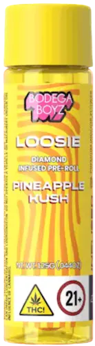 The Pineapple Kush Loosie is a 1.25-gram diamond-infused preroll crafted to deliver a tropical, terpene-rich smoking experience with serious potency. Each Loosie is made from premium indoor flower infused with THCa diamonds and coated in an additional layer of Bodega Boyz diamonds, creating a slow, even burn and an exceptionally smooth, powerful hit. The flavor profile leans heavily into sweet, tangy ripe pineapple, balanced by mellow, earthy Kush undertones that give the smoke both brightness and depth. The effects are described as relaxed, happy, balanced, relieved, and hungry, making it a hybrid that leans soothing without being overly sedating.