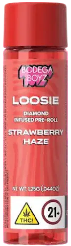 The Strawberry Haze Loosie from Bodega Boyz is a 1.25-gram diamond-infused preroll designed to deliver a bright, uplifting, and flavor-packed smoking experience. Each Loosie is crafted with premium indoor flower infused with THCa diamonds and coated in an additional layer of Bodega Boyz diamonds, creating a slow, even burn and an exceptionally potent hit. The flavor profile centers on the juicy sweetness of ripe strawberries, elevated by the classic Haze character that adds an energetic, slightly cerebral edge to the smoke. The effects are uplifted, euphoric, energetic, creative, and focused, making Strawberry Haze an ideal choice for daytime sessions, social settings, or any moment when you want a flavorful spark of motivation and mood elevation.