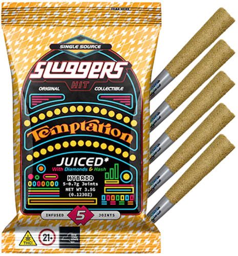 The Temptation Mini Blunts from Sluggers are crafted as a quad-infused, flavor-forward hybrid experience designed for smokers who want big potency in a compact format. Each 5-pack contains 0.7-gram mini blunts (3.5g total) made from single-source, whole-ground premium flower—never trim. Sluggers layers the infusion with diamonds, solventless hash, high-terpene extract, and a kief coating, creating a dense, slow-burning blunt with serious punch. The Temptation flavor profile leans sweet and tart, described by Sluggers as tasting like Sweet Tarts with a smooth, creamy undertone and subtle gas and earth beneath it. Effects are balanced and hybrid-leaning—uplifting and euphoric at first, then settling into a mellow, relaxed body feel that stays functional rather than heavy.