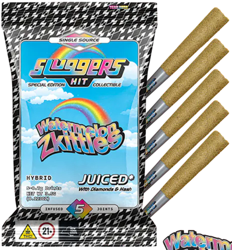 The Watermelon Zkittlez Pre-Roll 5 Pack from Sluggers delivers a sweet, candy-forward smoking experience built around bold flavor and high potency. Each pack contains five 0.7-gram infused pre-rolls (3.5g total) made with whole flower, then boosted with solventless hash and liquid diamonds, and finally rolled in diamonds for an extra-rich, slow-burning finish. The strain itself leans hybrid, known for its juicy watermelon sweetness, layered with the tropical, fruity, candy-like notes that define Zkittlez genetics.