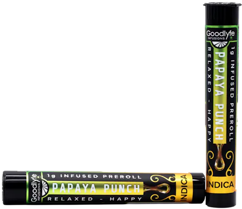 Papaya Punch from Good Lyfe is an indica-dominant hybrid that blends tropical sweetness with deeply calming effects. This strain is created by crossing Papaya and Purple Punch, resulting in a 60/40 indica-to-sativa balance that emphasizes relaxation while still offering a touch of cerebral uplift. Papaya Punch is known for its fruity, tropical, and citrus-forward flavor profile, often layered with subtle notes of tree fruit and even a faint cheesy undertones. Papaya Punch delivers a potent high that begins with a euphoric, giggly, and talkative cerebral buzz before settling into a soothing body relaxation, Many consumers choose it for winding down after social activities or for quiet nights at home, as it promotes a calm, sleepy, and stress-free state without overwhelming sedation.