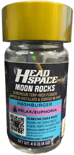 The Hashburger Moonrocks from Head Space are a 4-gram jar of ultra-potent, distillate-infused, kief-coated cannabis nuggets crafted for experienced consumers seeking a heavy, long-lasting high. Each Moonrock begins with dense flower that is soaked in powerful cannabis distillate and then rolled thoroughly in kief, creating a sticky, resin-rich exterior that burns slowly and delivers an intensely flavorful, terpene-saturated smoke. The Hashburger strain itself is known for its pungent, earthy, skunky, and fuel-like aroma, and the Moonrock format amplifies these characteristics, producing a bold, dank flavor profile with a powerful punch. Activation typically begins within minutes and can last for hours, making this product best suited for seasoned smokers who want maximum potency in a compact, slow-burning form.