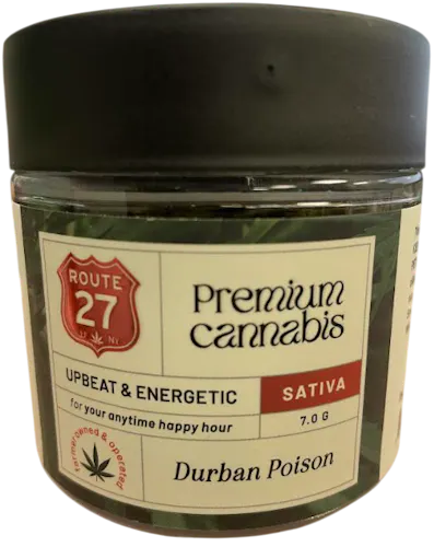 Route 27’s Durban Poison is a classic landrace sativa brought to life through their outdoor, sustainable cultivation on Long Island, delivering a pure, energetic high with a distinct flavor profile. Originating from South Africa, Durban Poison is renowned for its 100% sativa genetics, offering a clean, uplifting cerebral buzz that enhances focus, creativity, and motivation. Route 27 grows this cultivar outdoors in living soil using organic practices, which allows the plant to fully express its natural terpene profile under the local terroir. The aroma is sweet and spicy, with notes of anise, licorice, and earthy pine, while the flavor carries a herbal sweetness with subtle citrus undertones.