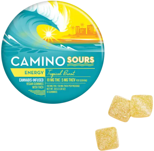 Have you ever dealt with a demanding schedule, approaching deadlines, and a sense of fatigue creeping in? This is precisely when Camino Sours Tropical Burst Energy gummies step in to give you just the boost you need. Packed with 10MG of THC and 5MG of THCV with sativa-like terpenes and the vitamins B6 and B12 combined with the perfect amount of caffeine (10mg), these gummies are your ticket to an enlivened experience.experience.