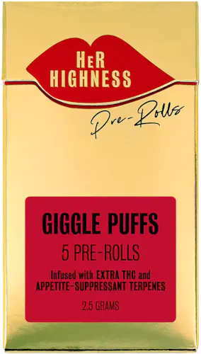 Giggle Puffs provide a euphoric, giggly, social high – the ideal happy high; perma-smile with energy. Infused with kief, distillate, and appetite-suppressant terpenes high in THC-V, they're low-munchies. Premium Rainbow Sherbet is a bubbly balanced sativa-hybrid made by crossing Champagne with Blackberry, for the ultimate mood lift. Her Highness ultra feminine pre-rolls are slim, elegant and beautiful to smoke, featuring an extra long crutch to protect nails and lashes. Includes five 0.5g infused prerolls.