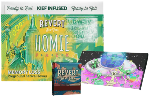 Memory Loss is a bright, energetic sativa known for delivering a cerebral, momentum-building uplift. It features sharp citrus aromas with herbal undertones, creating a lively, refreshing profile. This strain is designed for daytime use, pairing well with creative work, social settings, or any activity where focus and forward motion matter. Each Revert Homie Pack includes 14g of kief-infused ground flower, a Revert-branded matchbook, and a premium set of custom rolling papers.