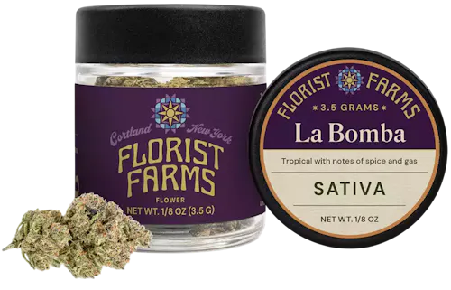 La Bomba from Florist Farms is a vibrant, energizing sativa known for its tropical-forward terpene profile, sharp notes of spice and gas, and clean, sun-grown character shaped by the farm’s regenerative, living-soil cultivation in Cortland, NY. Hand-trimmed for optimal quality, this strain delivers a smooth, flavorful smoke that opens with bright tropical fruit before deepening into warm spice and subtle fuel undertones, creating a layered sensory experience. La Bomba offers an uplifting, clear-headed high that boosts focus, creativity, and motivation—ideal for daytime use or any moment requiring mental clarity and positive momentum.