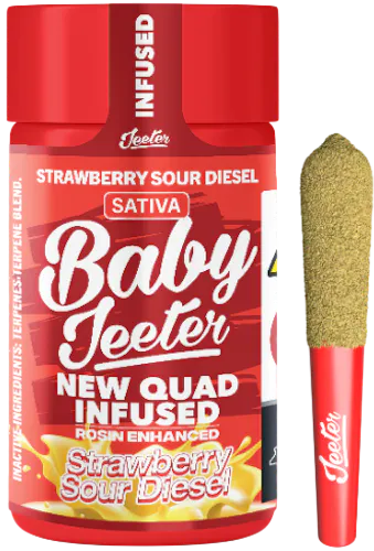 Jeeter's Strawberry Sour Diesel is a sativa strain resulting from the cross between two legacy strains: Sour Diesel and Strawberry Cough. This strain offers a sweet, candied strawberry aroma with subtle floral notes on the inhale. The exhale brings a sharp, citrusy pine flavor complemented by a diesel gas aftertaste.