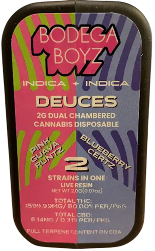 The Bodega Boyz live resin dual-chamber Pink Guava Runtz / Blueberry Certz all-in-one vape brings together two terpene-rich strains in a sleek, ready-to-use device that emphasizes flavor, potency, and variety. The Pink Guava Runtz chamber leans into a tropical, candy-sweet profile—bright guava, creamy fruit notes, and that signature Runtz sugary aroma—delivering a smooth, dessert-like inhale with an uplifting, mood-brightening character often associated with sweeter, hybrid-leaning strains. The Blueberry Certz side shifts into a deeper, berry-dense flavor: ripe blueberry, cool herbal undertones, and a more grounded, soothing finish. Because both chambers use live resin, the natural terpene complexity is preserved, giving each strain a fuller, more authentic expression. Users commonly describe the combined experience as a balance between euphoric, head-focused uplift from Pink Guava Runtz and calming, body-oriented relaxation from Blueberry Certz, allowing you to switch between energetic sweetness and mellow berry smoothness depending on your mood.