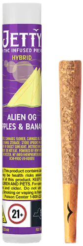 Jetty’s Alien OG × Apples & Bananas infused pre-roll is a potent hybrid that blends fruity sweetness with piney gas for a balanced, euphoric smoke. Crafted with top-shelf, pesticide-free flower grown by legacy farms and infused with Jetty’s High THC concentrates (such as live resin or cold water hash), this pre-roll delivers a smooth, flavorful experience that highlights the unique genetics of both strains. Alien OG contributes its classic earthy, pine-forward potency, while Apples & Bananas adds a juicy, tropical funk with hints of sweetness, resulting in a layered flavor profile that’s both bold and refreshing. The effects are described as relaxed, happy, uplifted, and creative, offering a hybrid balance that grounds the body while sparking mental energy.