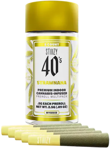 Stiiizy 40’s Strawnana prerolls are high-potency, live-resin–infused joints designed to deliver a sweet, fruit-forward hybrid experience with serious strength. Each preroll is packed with indoor-grown Strawnana flower, infused using Stiiizy’s proprietary live resin infusion method, and then evenly coated in kief for an extra punch. The flavor profile leans heavily into its name—strawberry, banana, and sugary sweetness—creating a smooth, dessert-like inhale with a clean, flavorful exhale. Effects are described as relaxed, happy, euphoric, and talkative, offering a balanced hybrid high that keeps you uplifted and mentally engaged while still melting tension from the body.