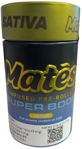 The Super Boof Mates prerolls from Muha Meds take the naturally loud, candy-citrus personality of the Super Boof strain and amplify it with the brand’s signature infused style. Each preroll is packed with Super Boof flower—already known for its sweet cherry, orange zest, and tropical cookie-like flavor—then boosted with Muha Sauce, the melted-diamond live resin concentrate that deepens both potency and terpene richness. A flavorful smoke that opens with bright fruit and creamy sweetness before settling into a warm, earthy finish. Effects tend to feel upbeat and euphoric at the start, often sparking laughter, creativity, and a light, social buzz, while the body high stays mellow and comforting without tipping into couch-lock.
