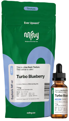 Organic MCT oil is infused with MFNY single source Turbo Blueberry live resin: distinctive soft blueberry aroma of the Blueberry Muffin and Lemon Cane cultivars; known to promote an relieving body high. With activated THC entering the bloodstream at a more rapid rate, people may experience relief from anxiety, pain, and nausea; others say it can create an appetite or aid with sleep. The dropper means that whether you’re a beginner or enthusiast, you can choose a lighter or heavier dose that’s just right (your “Goldilocks Zone”). NOTE: When taken sublingually (under the tongue), effects can take anywhere from 15 mins to 2 hrs to begin, and may last longer than other consumption methods. So make sure to dose conservatively your first couple of tries.