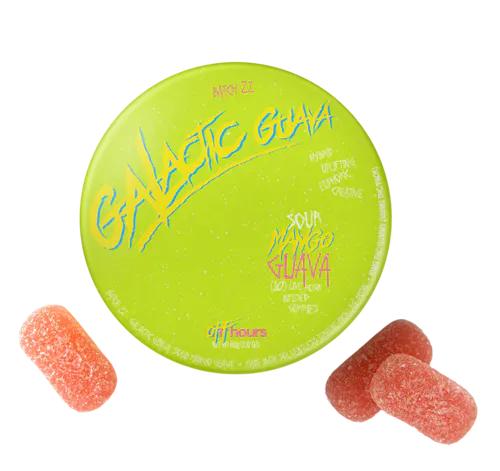 The Galactic Guava Gummy is a 100mg live-rosin infused edible crafted by Off Hours, designed to deliver a bright, tropical, and full-spectrum experience. Made using solventless live rosin pressed from fresh-frozen New York cannabis flower using only ice, water, heat, and pressure. The flavor is intensely tropical: a tangy blend of sour passionfruit, ripe mango, and sweet guava, creating a juicy, candy-like burst with every bite. Each gummy contains 10mg THC, totaling 100mg per pack, and users often describe the effects as uplifting, euphoric, creative, and colorful, with a balanced hybrid feel that avoids heaviness.