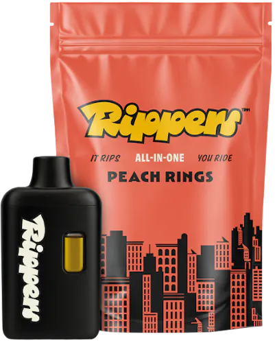Peach Rings by Rippers delivers a sweet, nostalgic burst of peach-candy flavor wrapped in the brand’s signature smooth, terpene-rich vapor. On the inhale, it opens with bright, juicy peach notes—think gummy rings dusted in sugar—followed by subtle hints of citrus and stone fruit that round out the profile. The vapor is typically dense yet gentle, offering a creamy finish that keeps each pull satisfying without harshness. True to the Peach Rings strain lineage, this all-in-one tends to provide a balanced hybrid experience: uplifting at first, easing into a warm, relaxing body feel that’s perfect for unwinding without becoming overly sedating.