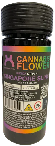 The Singapore Sling 14g jar from Urban Xtracts is a premium indica flower offering a tropical, terpene-rich experience with a THC content of 25.40%. Packaged in a generous 14-gram format, this mixed light-grown strain is ideal for seasoned consumers seeking a flavorful and relaxing smoke. Singapore Sling is bred from Creamsicle × Tiki Cookies, and its aroma bursts with creamy peanut butter, bright cherry, and juicy watermelon — a dessert-like profile that lingers on the palate. The buds are dense, frosty, and vibrant, showcasing Urban Xtracts’ commitment to quality and sustainable cultivation. Effects lean toward relaxation, sleepiness, and mood elevation, making this strain perfect for evening use or unwinding after a long day.