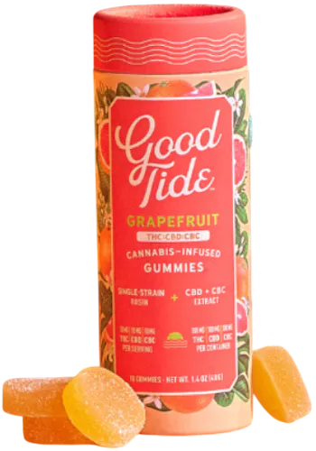 Good Tide Grapefruit THC:CBD:CBC gummies pair a Sativa single-strain rosin with the mood-boosting effects of CBC for citrusy, decadent treat that will have you feeling your very best with every bite.