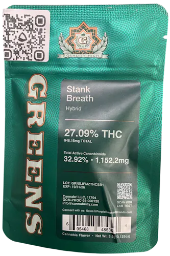 Greens Cannabis Stank Breath is a high-THC hybrid flower that combines the naturally pungent, gassy profile of the original Stank Breath strain with Greens’ emphasis on potency and terpene richness. The underlying genetics—Sharksbreath × OG Kush—produce a bold, skunky aroma layered with black pepper, earth, blue cheese, and apricot notes. The effects begin with a quick, energizing cerebral lift that boosts creativity, focus, and talkativeness before settling into a deep, relaxing body high typical of its indica-leaning lineage.