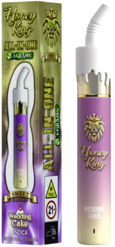 Honey King’s Sweet Edition Wedding Cake AIO delivers a rich experience built around the classic Wedding Cake profile—creamy vanilla, sweet dough, and subtle earthy spice—enhanced by the Sweet Edition’s focus on bold, candy-smooth vapor. The strain’s signature blend of sugary frosting and warm, cookie-like undertones, gives it a decadent, bakery-fresh feel. The effects tend to open with a warm, euphoric head lift that softens stress and brightens mood, followed by a deep, soothing body relaxation that settles in gradually without immediately becoming sedating.