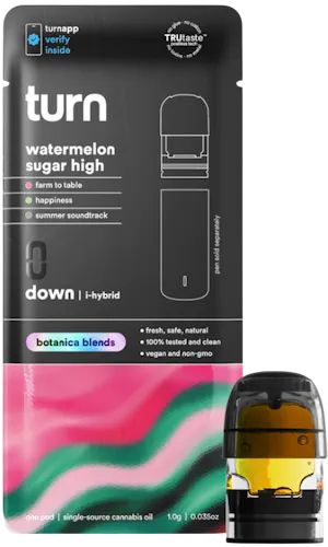The flavor profile is inspired by ripe watermelon, offering a juicy, candy-like sweetness with refreshing tropical undertones that make each puff feel light and indulgent. As part of Turn’s Botanica Blends line, it emphasizes purity and terpene preservation, resulting in a clean, aromatic vapor. The effects are described as both relaxing and stimulating—users often feel happy, inspired, and at ease, while also experiencing a gentle uplift that sparks creativity or philosophical reflection.